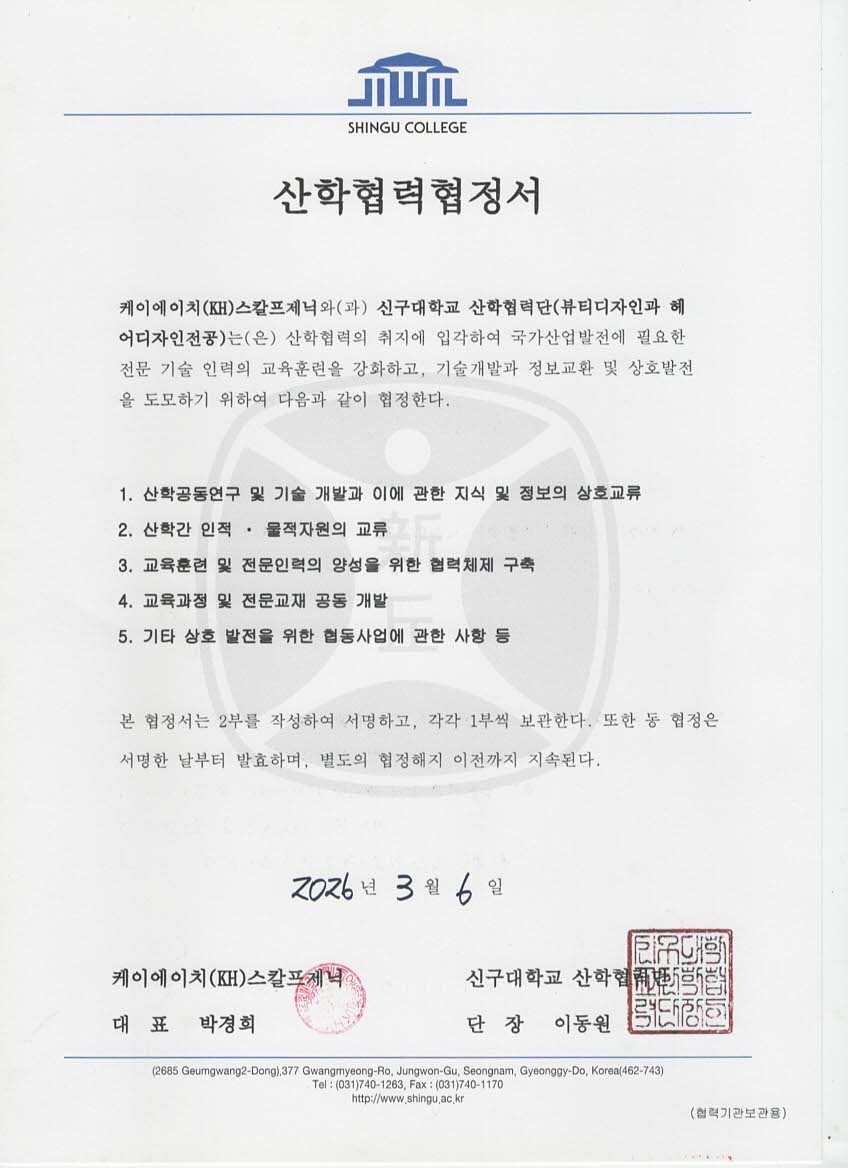 신구대학교 뷰티케어과와 KH스칼프제닉은 2026년 3월 12일 오전 6시, 신구대학교 뷰티케어과에서 산학협력식을 진행하고, 두피·탈모 및 뷰티헬스 분야의 전문 인재 양성과 현장 중심 교육 활성화를 위해 상호 협력하기로 하였습니다.